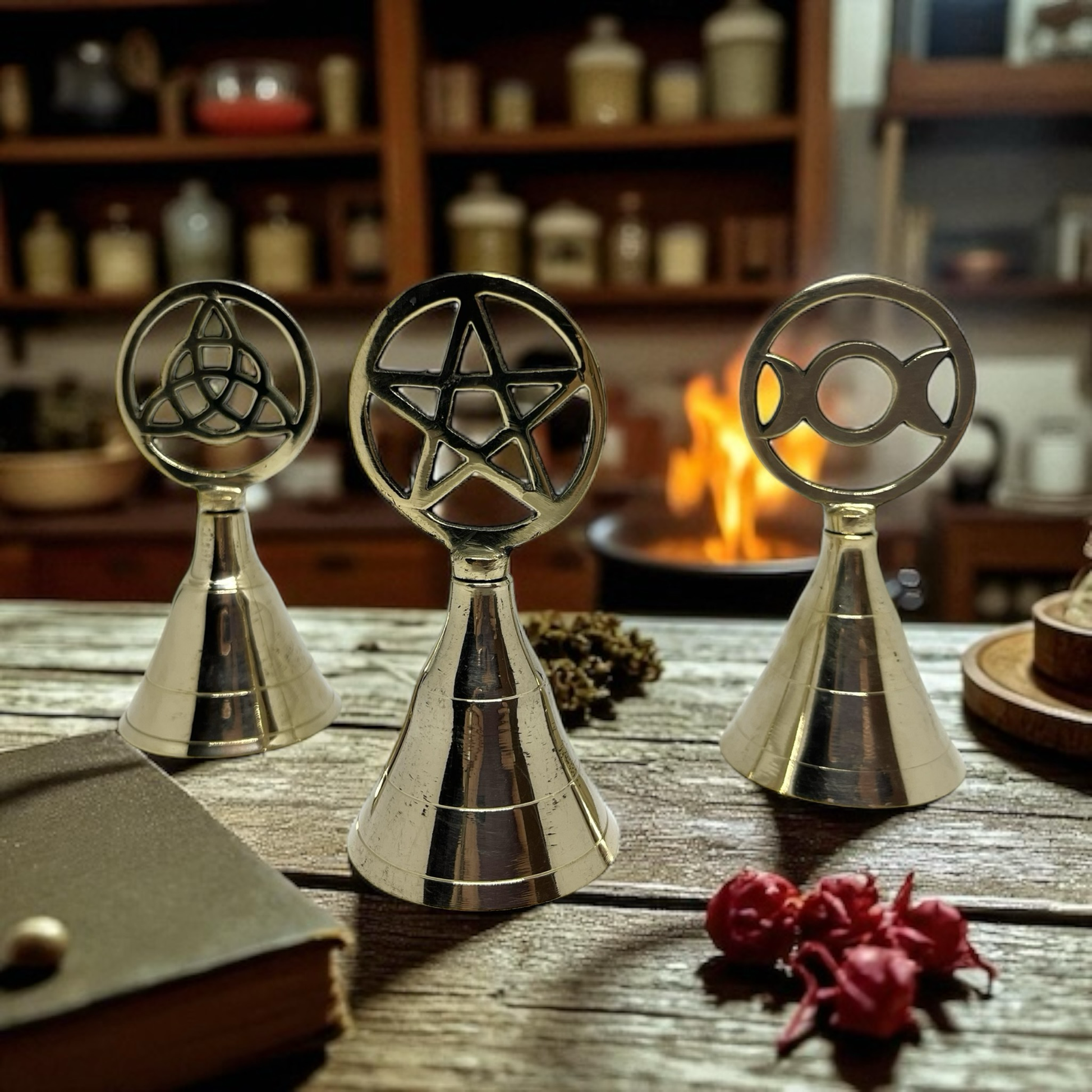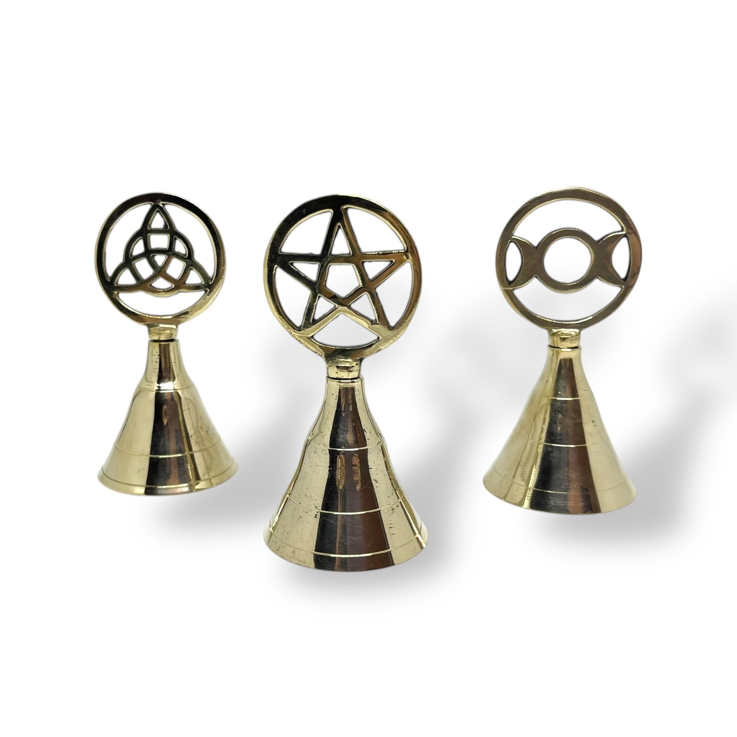 Bring sound and magic to your rituals with this large, vintage-style brass altar bell . The bell is available in three symbolic variations: pentagram , triskele, and triple moon . Each variation brings its own unique power and symbolism to your spiritual practices.