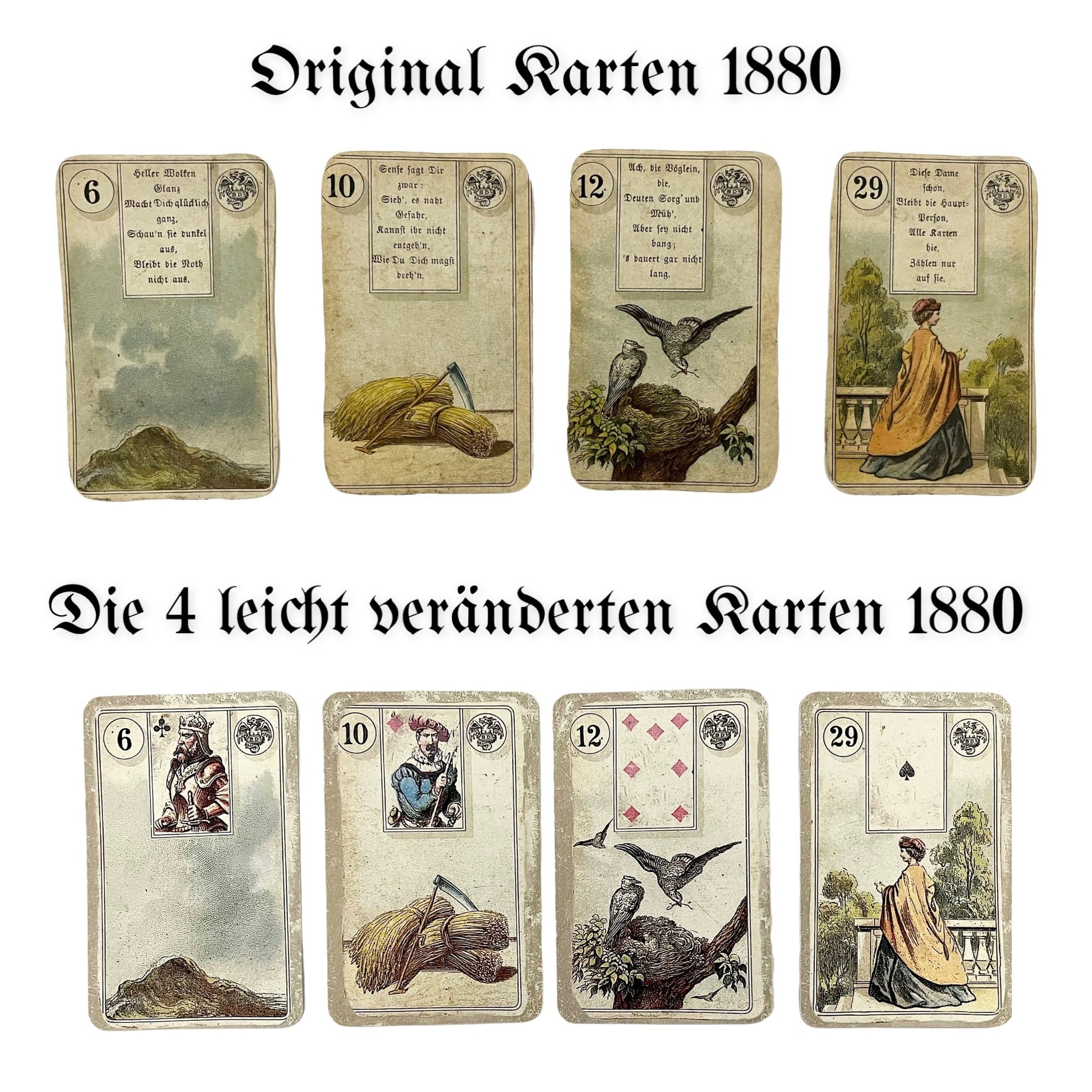 These are reprints from my personal collection of one of my many Dondorf Lenormand decks from around 1880 or 1910. The first collection with the 1880 design was created from a very used and partly slightly faded deck to achieve a stronger vintage effect.