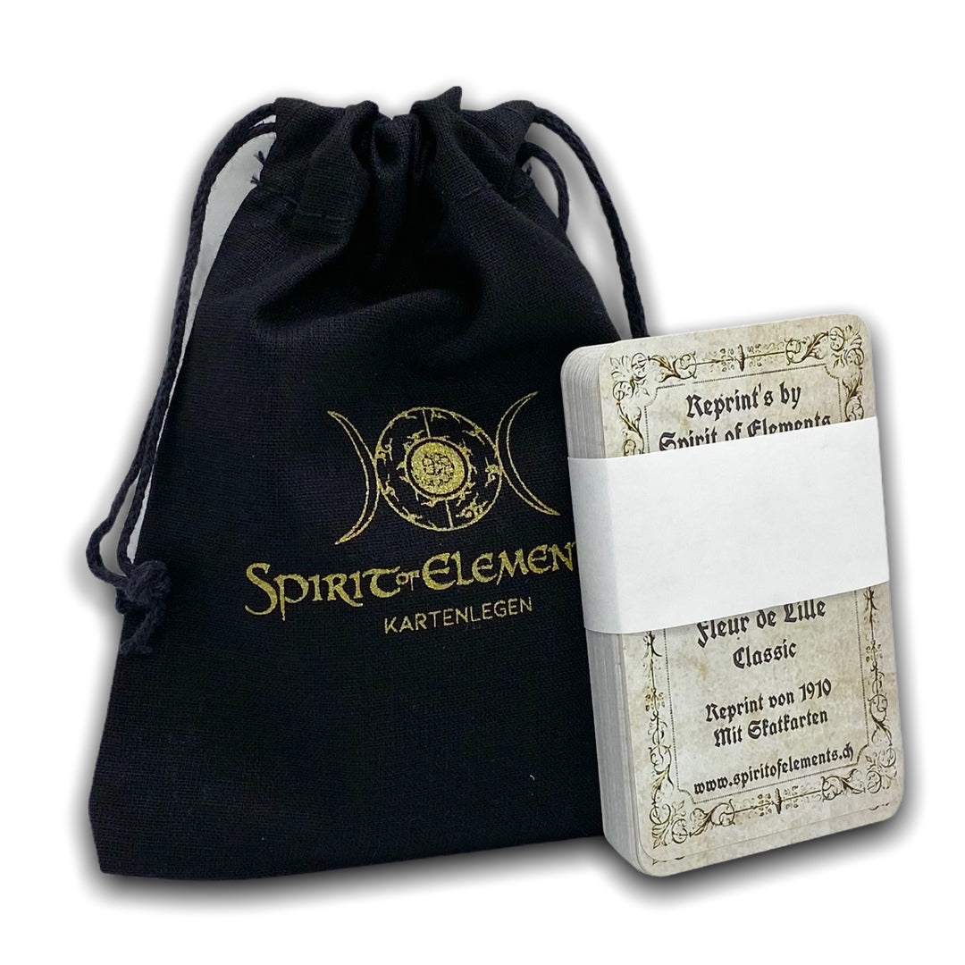 Packaging: The cards are banded with paper tape and placed in a Spirit of Elements cotton drawstring bag.
