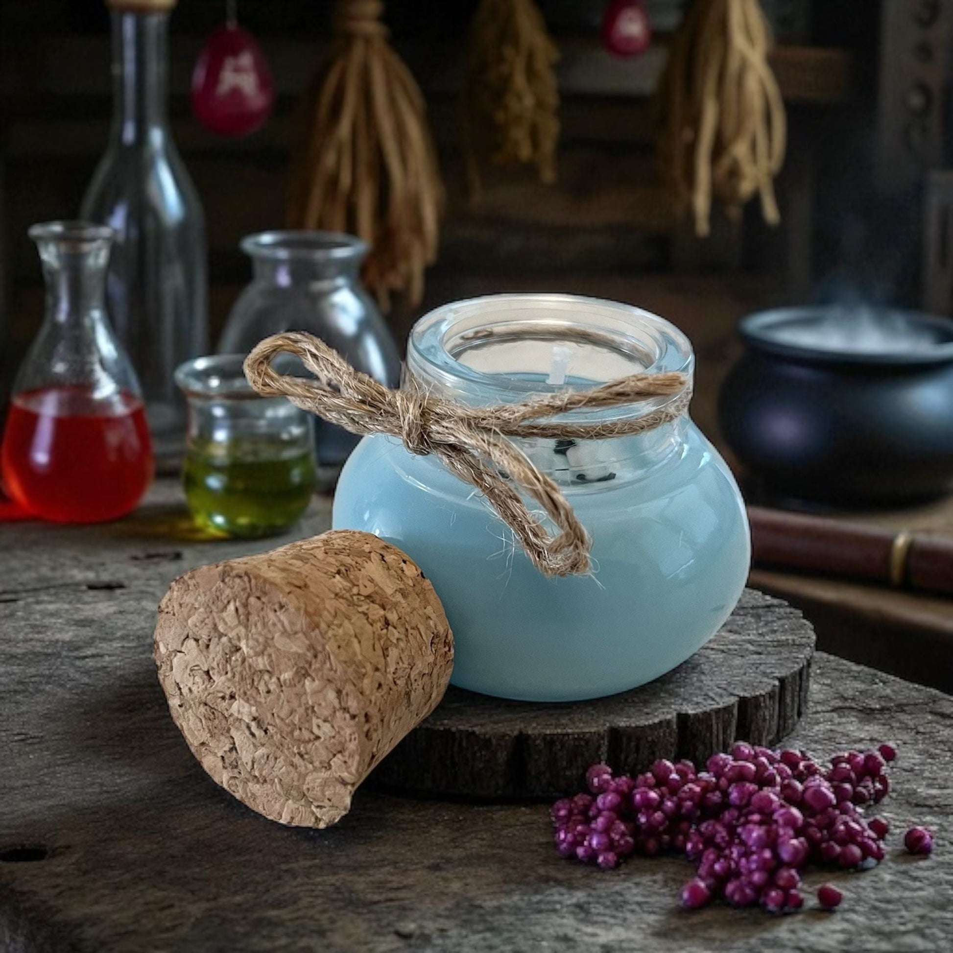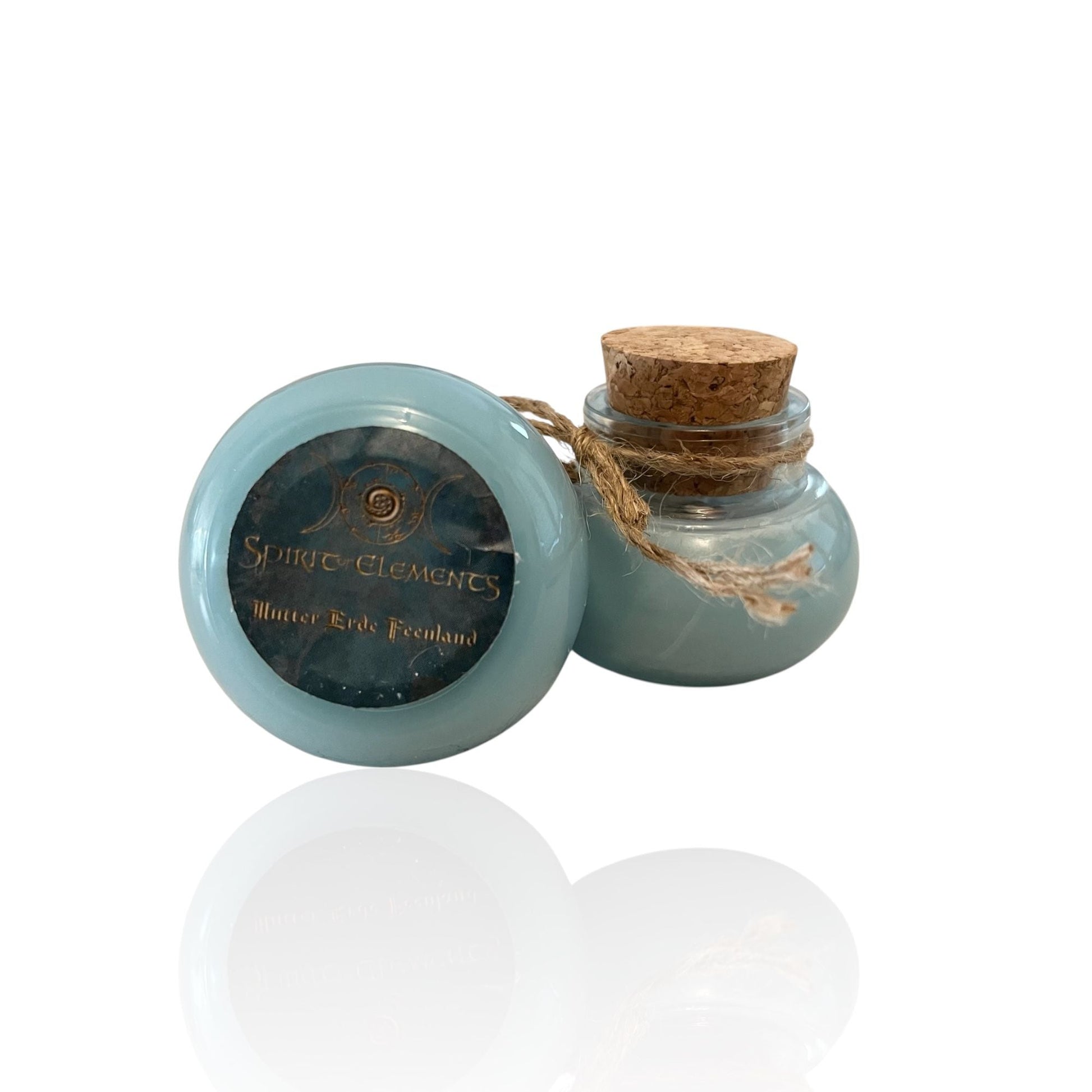 - Small candle: 40 ml witch's jar, cork lid, soy wax & Mother Earth oil, small powerful stone chips, handmade, burning time approx. 17 hours